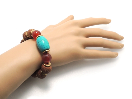 エスニックブレスレット 天珠型ターコイズ20x15ミリ レッドアゲート12ミリ 鳳眼菩提樹15ミリ 純黄銅ボタン 手首サイズ17cm 超レア一生もの・入手困難・高級一点物現品限り [送料無料]