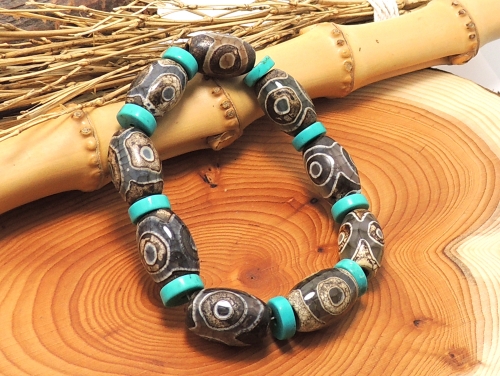 天珠&ターコイズで組み合わせたブレスレットです。チベット天珠は身に着けることによって、自分や家族に功名、財富、幸福をもたらす力を秘めていると古えより言い伝えられています。