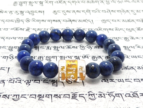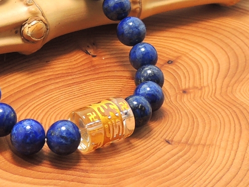 クリスタル六字真言&ラピスラズリで組み合わせたブレスレットです。六字真言は大乗仏教の経典である『六字大明王陀羅尼経』や『仏説大乗荘厳宝王経』では、この真言を唱えれば、様々な災害や病気、盗賊などから観世音菩薩が護ってくれると、この真言を唱えた際の効果が説かれている。