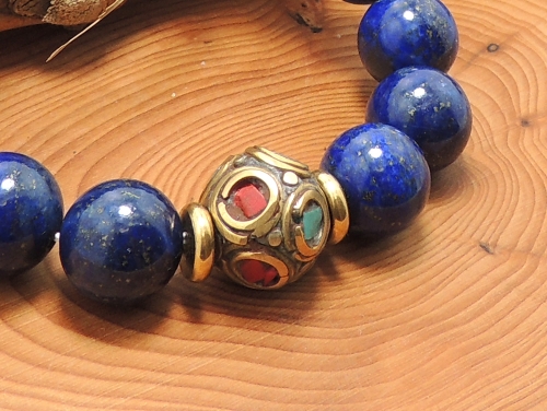 チベットハンドメイドビーズ&ラピスラズリで組み合わせたブレスレットです。チベットの伝統職人によるハンドメイドのビーズです。 真鍮の土台にラピスラズリ・レッドコーラル・ターコイズなどのパワーストーンを贅沢にちりばめた伝統デザインの素敵なビーズです。 全ての工程は手作業で、パワーストーンをふんだんに使うため、全く同じものはひとつとしてありません。アンティーク風に加工されていますので、石の状態や細かい細工などにラフな部分が見られる場合もありますが、チベットデザインの個性として受け止めてください。