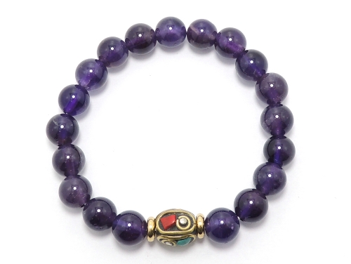 エスニックブレスレット・アジアンパワーストーン チベットハンドメードビーズ(4面カット)角柱10ミリ アメジストAAA(2月誕生石)8ミリ チベット合金真鍮6ミリ 金運・復縁・恋愛運・魔除・厄除 [サイズ選べる][日本製][送料無料] (11433)