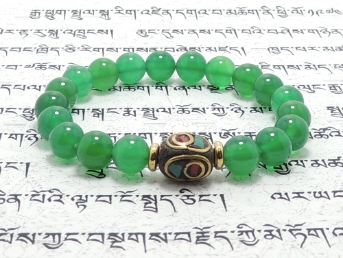 エスニックブレスレット・アジアンパワーストーン チベットハンドメードビーズ(4面カット)角柱10ミリ グリーンカルセドニーAAAA8ミリ チベット合金真鍮6ミリ 金運・対人関係・魔除・厄除 [サイズ選べる][日本製][送料無料] (11437)